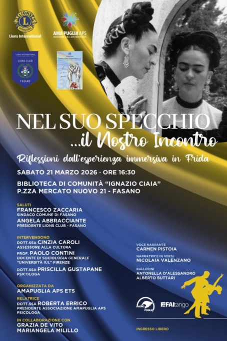 Il Lions Club Fasano, sabato 21 marzo, alle ore 16,30, nella biblioteca di comunità “Ignazio Ciaia” di Fasano presenterà “Nel suo specchio…il nostro incontro. Riflessioni dall’esperienza immersiva in Frida”, un’occasione per parlare della tutela dei diritti della donna con riferimento alla figura di Frida Kalo, esempio di come si possa trasformare la sofferenza e il dolore in arte.L’appuntamento culturale, organizzato in collaborazione con l’associazione “Ama Puglia aps ets” ed aperto all’intera cittadinanza, si avvierà con i rituali saluti di Angela Abbracciante, presidente del Lions Club Fasano, e di Francesco Zaccaria, sindaco di Fasano.