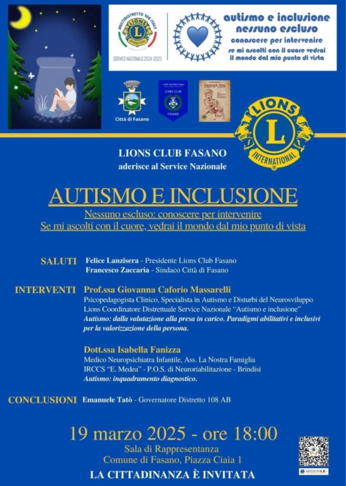 Il Lions Club Fasano, mercoledì 19 marzo, alle ore 18, nella sala di rappresentanza del Comune di Fasano, presenterà una serata sul tema “Autismo e inclusione. Nessuno escluso: conoscere per intervenire. Se mi ascolti con il cuore vedrai il mondo dal mio punto di vista”.Il convegno, patrocinato dal Comune di Fasano ed aperto all’intera cittadinanza, si avvierà con i rituali saluti di Felice Lanzisera, presidente del Lions Club Fasano, e di Francesco Zaccaria, sindaco di Fasano.