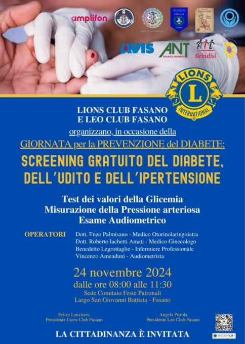 Lions Club Fasano e Leo Club insieme per la prevenzione del diabete, dell'ipertensione e delle patologie dell'udito con controlli aperti a tutti i cittadini.Il Lions Club Fasano, presieduto da Felice Lanzisera, ed il Leo Club Fasano, presieduto da Angela Pistola, domenica 24 novembre 2024 saranno impegnati in una intensa giornata in favore della salute dei cittadini con screening gratuiti di grande utilità per prevenire il diabete e le problematiche relative all'udito ed all'ipertensione.