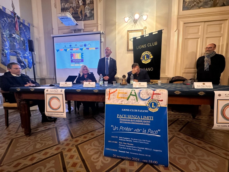 Il Lions Club Fasano ha premiato gli studenti che hanno partecipato al concorso internazionale "Un poster per la pace".Mercoledì 20 novembre presso la sala di rappresentanza del Comune di Fasano, il Lions Club Fasano ha premiato gli studenti che hanno partecipato al concorso internazionale "Un poster per la pace", quest'anno intitolato "Pace senza limiti".