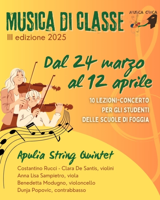 Con la nuova edizione di “Musica di classe”, l’Associazione Musica Civica rinnova il suo impegno nella formazione dei giovani con attività musicali a carattere didattico e divulgativo dedicate alle studentesse e agli studenti delle scuole di Foggia. La rassegna 2025, in programma dal 24 marzo al 12 aprile, coinvolgerà quattro Istituti Comprensivi della città: “Santa Chiara-Pascoli-Altamura”, “Parisi-De Santis”, “San Pio X-G. Bovio” e “V. Da Feltre-N. Zingarelli”, che saranno teatro di 10 lezioni-concerto.