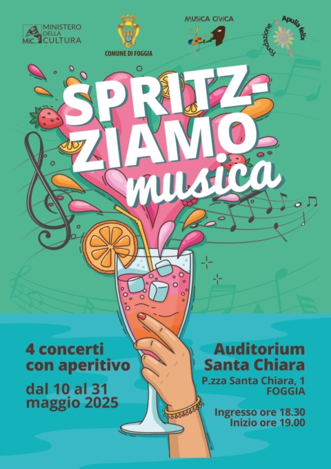 Dal 10 al 31 maggio l'Auditorium Santa Chiara di Foggia si anima con "Spritz–ziamo Musica", un ciclo di quattro eventi con performance di musica dal vivo, spettacolari videomapping show e, per rendere tutto ancora più speciale, un delizioso aperitivo al termine di ogni concerto. L'iniziativa, già proposta con grande successo e sold out ad ogni evento l'anno scorso, è organizzata dall'Associazione Musica Civica, presieduta dal M° Dino De Palma, da sempre attiva nella promozione di eventi culturali innovativi e di alto livello artistico.
