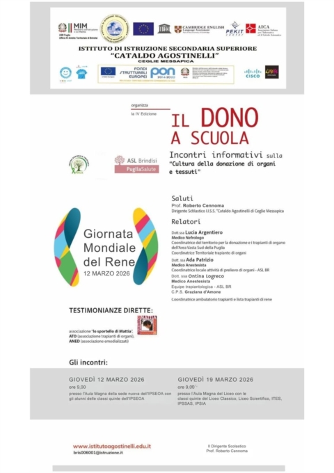 In occasione della Giornata Mondiale del Rene, che si celebra il 12 marzo, la Nefrologia e Dialisi della Asl Brindisi, con sede a Francavilla Fontana promuove iniziative di sensibilizzazione dedicate alla prevenzione delle malattie renali e alla diffusione della cultura della donazione di organi e tessuti, con momenti di informazione rivolti anche agli studenti del territorio.L’attività è promossa dalla Struttura complessa di Nefrologia e Dialisi diretta dal dottor Luigi Vernaglione, con il coordinamento della UOS di Francavilla Fontana guidata dal dottor Massimo Di Tullio, e vede impegnati i dirigenti medici Lucia Argentiero, Domenica Biasi, Salvatore Fersini, Francesco Rini, Claudia Elefante, Matteo Capone e Franco Di Tano.
