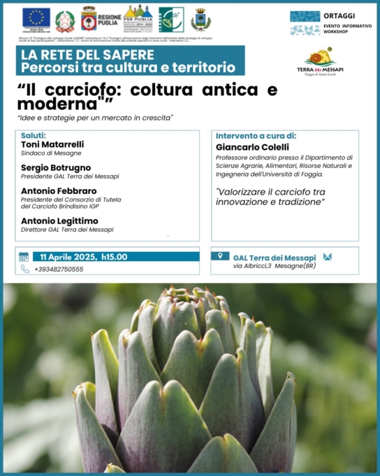 Il GAL TERRA DEI MESSAPI organizza, nell'ambito degli incontri dedicati a cultura e territorio, un convegno sul tema :"Il carciofo: coltura antica e moderna. "Idee e strategie per un mercato in crescita"