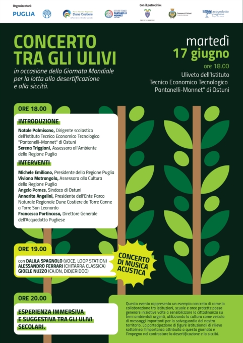 CONCERTO TRA GLI ULIVI MARTEDI 17 GIUGNO A OSTUNIUna serata di riflessione e di musica. Così il parco naturale regionale delle Dune Costiere da Torre Canne a Torre San Leonardo celebra la giornata mondiale per la lotta alla desertificazione e alla siccità. Appuntamento prossimo martedì 17 giugno nell'uliveto dell'Istituto Tecnico Economico Tecnologico "Pantelli-Monnet" di Ostuni. Tre i momenti in cui si snoderà la serata. Alle 18 un confronto sugli effetti dei cambiamenti climatici e la necessità di adottare misure efficaci per mitigare le cause e pianificare azioni di adattamento. Dopo l'introduzione del dirigente scolastico Natale Palmisano e dell'assessore regionale all'ambiente Serena Triggiani, previsti gli interventi del presidente della Regione Emiliano, dell'assessore regionale alla Cultura Viviana Matrangola, del sindaco di Ostuni Angelo Pomes, del presidente dell'ente parco Dune Costiere Annarita Angelini e del direttore generale dell'Acquedotto Pugliese Francesca Portincasa. Alle 19 il concerto di musica acustica tra gli ulivi con le esibizioni del trio composto da Dalila Spagnolo ( voce ), Alessandro Ferrari ( chitarra classica ) e Gioele Nuzzo ( cajon, dijeridoo, tamburi ). Quindi la suggestiva conclusione con l'esperienza immersiva tra gli ulivi secolari.