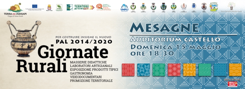 Alle ore 18.00 nell’Auditorium del Castello Normanno Svevo è in programma il convegno/dibattito con la presentazione dei risultati ottenuti nella passata programmazione 2007/2013 e un confronto con il pubblico sulle strade da intraprendere per la crescita alla luce delle opportunità presenti. Seguirà la proiezione del video-documentario “La Terra dei Messapi – Mesagne”, girato dal regista Simone Salvemini, che racconterà le bellezze di Mesagne.