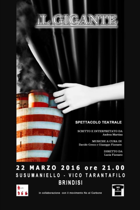Martedì 22 marzo 2016 alle ore 21.00, presso la Vineria Susumaniello in Vico Tarantafilo a Brindisi si terrà lo spettacolo teatrale "IL GIGANTE" scritto e interpretato da Andrea Martina, regia di Lucia Fiorante, musica ed effetti sonori a cura di Davide Greco e Giuseppe Fiorante, entrambi componenti della band salentina Trivellor.L'evento è promosso dal Susumaniello in collaborazione il movimento NO AL CARBONE - Brindisi.