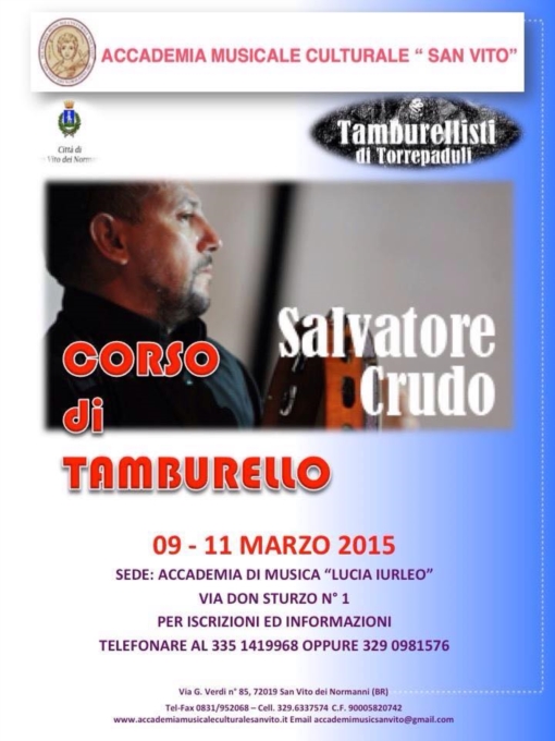 Da lunedì 9 a mercoledì 11 marzo appuntamento con la grande musica della tradizione salentina per l’Accademia Musicale Culturale San Vito che, in collaborazione con i Tamburellisti di Torrepaduli e con il patrocinio del Comune di San Vito dei Normanni, organizza il corso di tamburello con il maestro Salvatore Crudo.Salvatore Crudo, originario di Torrepaduli, si appassiona alla danza sin da piccolo. Con Pierpaolo De Giorgi e Rocco Luca, è uno dei fondatori del gruppo “I Tamburellisti di Torrepaduli”.