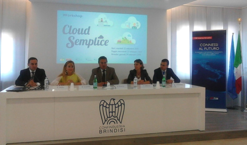 Si è concluso ieri nella sede di Confindustria Brindisi l’ultimo dei tre seminari formativi organizzati da TIM e CLE di Bari - realtà emergente a livello nazionale attiva nella realizzazione di prodotti e servizi specialistici in ambito IT – sul tema del Cloud Computing, l’insieme di tecnologie che consente l’archiviazione, l’elaborazione e la trasmissione dei dati direttamente in rete tramite accesso a Internet, sulla cosiddetta ‘nuvola’.Se fino a oggi molte aziende hanno vissuto con diffidenza la possibilità di avvalersi di servizi informatici online, gli ultimi dati dell’Osservatorio Cloud & ICT as a Service - School of Management del Politecnico di Milano evidenziano che il mercato Cloud in Italia viene stimato in crescita del 25% nel 2015 ed è destinato a raggiungere un valore superiore a 1,5 miliardi di euro.