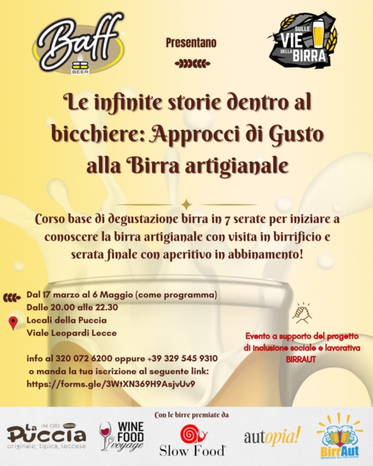 Il corso, nato dalla collaborazione tra il birrificio Baff Beer, La Puccia Lecce, il progetto Sulle vie della Birra e l’associazione Winefoodvoyage a sostegno del progetto BIRRAUT, permetterà di approcciarsi con maggiore consapevolezza alla birra artigianale, affrontando differenti temi, dalla degustazione alla storia; dalla produzione agli abbinamenti birra cibo, mettendo in evidenza gli aspetti di inclusione sociale. Ogni incontro sarà scandito dalla degustazione guidata di 3 birre di differenti birrifici, pugliesi e nazionali