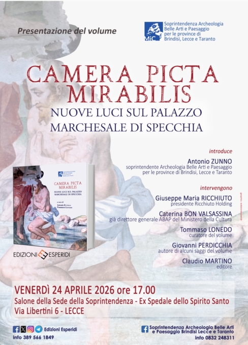 Venerdì 24 aprile 2026 alle ore 17.00, il Salone della Sede della Soprintendenza - ex Spedale dello Spirito Santo (Via Libertini 6) a Lecce, accoglierà la presentazione del volume “Camera Picta Mirabilis. Nuove luci sul palazzo marchesale di Specchia”, curato da Antonio Zunno e Tommaso Lonedo, edito da Edizioni Esperidi. Introdurrà l’incontro Antonio Zunno soprintendente Archeologia Belle Arti e Paesaggio per le province di Brindisi, Lecce e Taranto. Seguiranno poi gli interventi di: Giuseppe Maria Ricchiuto presidente della Ricchiuto Holding, Caterina Bon Valsassina già direttore generale ABAP del Ministero della Cultura, Tommaso Lonedo curatore, Giovanni Perdicchia autore di alcuni testi del volume. Sarà presente l’editore Claudio Martino. Info 389 566 1849 / 0832 248311.Il volume. Ubicato nel cuore della piccola cittadina di Specchia, nel sud della Puglia, il palazzo marchesale è stato recentemente interessato da complesse e importanti operazioni di recupero, avviate grazie alla determinazione del proprietario e committente e che hanno interessato la parte di sua proprietà. Gli ambienti e in particolare la cappella restituiscono la magnificenza di un ciclo pittorico che qui, nel volume, viene svelato e raccontato. L’auspicio è che l’intera struttura possa, prima o poi, ricevere l’adeguata attenzione, restaurata, recuperata e restituita alla comunità di Specchia e ai visitatori che arrivano numerosi ogni anno in quello che è considerato uno dei borghi più belli d’Italia, e che da decenni ormai si distingue per le numerose attività culturali e di valorizzazione.