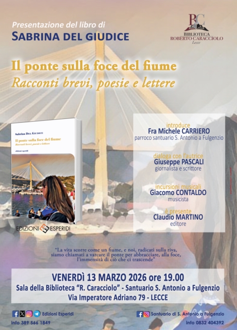 Venerdì 13 marzo 2026 alle ore 19.00, la Sala della Biblioteca “R. Caracciolo” del Santuario di S. Antonio a Fulgenzio, a Lecce (Via Imperatore Adriano 79), accoglierà la presentazione ufficiale del libro “Il ponte sulla foce del fiume. Racconti brevi, poesie e lettere”, di Sabrina Del Giudice, edito da Edizioni Esperidi.Dopo i saluti del parroco fra Michele Carriero, a dialogare con l’autrice sarà il giornalista e scrittore Giuseppe Pascali mentre la musica di Giacomo Contaldo allieterà la serata. Sarà presente l’editore Claudio Martino. Info 389 566 1849 / 0832 404392.