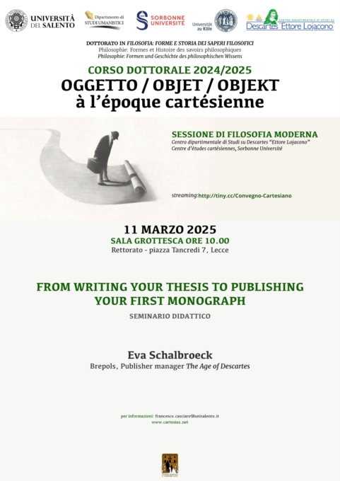 Le attività proseguiranno l'11 marzo 2025, con un seminario didattico dal titolo "From Writing Your Thesis To Publishing Your First Monograph", tenuto da Eva Schalbroeck, Publisher manager presso l’editore Brepols, che ospita la prestigiosa collana di studi cartesiani The Age of Descartes, diretta da Igor Agostini.