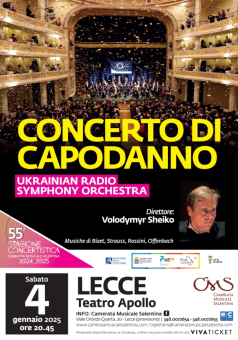 Sabato 4 Gennaio 2025, ore 2.45La Camerata Musicale Salentina celebra l'arrivo del nuovo anno con il tradizionale "Concerto di Capodanno", che quest'anno vede ospite l'Ukrainian Radio Symphony Orchestra guidata dal suo direttore principale Volodymyr Sheiko, in programma sabato 4 gennaio 2025 alle 20,45 al Teatro Apollo di Lecce.