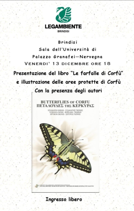 Legambiente Brindisi Circolo "t. Di Giulio" organizza venerdì 13 dicembre 2013 alle ore 18 presso la sala dell'Università di Palazzo Granafei - Nervegna la presentazione del libro "Butterflies of Corfu", un interessante lavoro e studio realizzato dal Circolo Legambiente di Corfù.saranno presenti gli autori che illustreranno anche le aree protette dell'isola di Corfù.