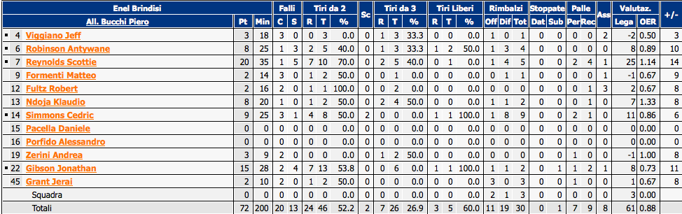 In attacco il Brindisi si è affidato principalmente a Scottie Reynolds, 20 punti realizzati 15 falli subiti, 7 su 10 da due, 5 rimbalzi, 4 recuperi e 25 di valutazione. È stato lui il braccio armato di una squadra che ha letteralmente ingabbiato l’avversario. Bene in fase di produzione anche Gibson, che si è fermato a 15 punti.