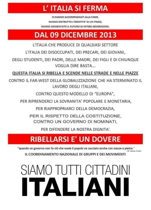 Il coordinamento del 9 Dicembre 2013 città di Brindisi, in relazione allo sciopero nazionale di tutte le categorie produttive indetto per lunedì 9 Dicembre, comunica che il 9/12 dalle ore 09:00 si muoverà corteo di protesta dal Parco Cesare Braico – Via Appia, Brindisi per raggiungere Palazzo Nervegna – P.zza Sottile De Falco, Brindisi dove sarà dislocata la postazione fissa della protesta.Dal medesimo blocco partirà anche il gruppo che andrà a raggiungere il Sit In degli autotrasportatori a Costa Morena.