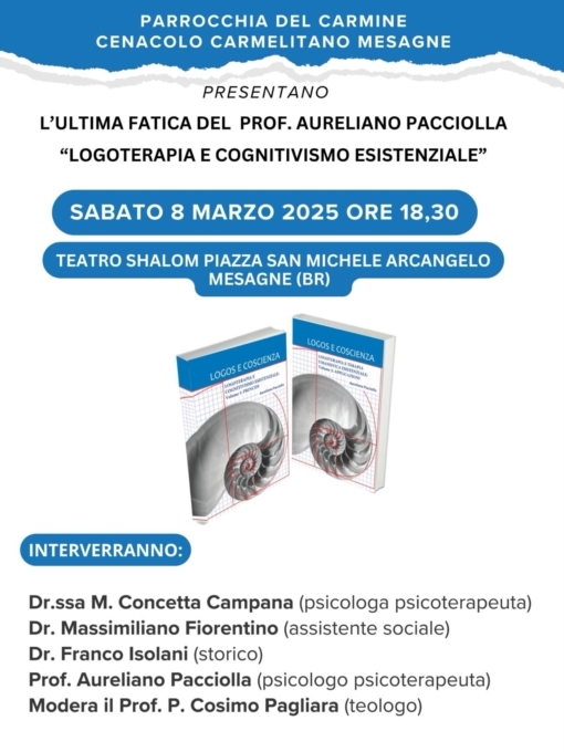 .....edito da Humanitas Edizioni, è un libro scritto dal prof. Aureliano Pacciolla che ha come obietto quello di dare un contributo alla psicologia clinica e alla ricerca, con un approccio umanistico-esistenziale, centrato sul senso della vita che Viktor Frankl ha ideato e applicato nella Logoterapia. La ricerca sarà presentata sabato 8 marzo alle ore 18,30 presso il teatro Shalom dei padri Carmelitani di Mesagne al civico 1 di piazza San Michele Arcangelo. Con l’Autore dialogheranno Maria Concetta Campana (Psicologa e Psicoterapeutica); Massimiliano Fiorentino (Assistente sociale); Franco Isolani (Storico). Modererà l’incontro il Prof. Cosimo Pagliara, teologo e Provinciale dei Padri Carmelitani.L’Autore è il Prof. Aureliano Pacciolla (Psicologo, psicoterapeuta, docente di Psicologia della Personalità e di Picoterapia).