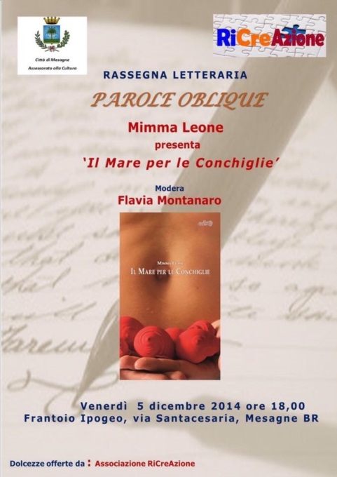 Sarà l’autrice Mimma Leone ad aprire la rassegna, venerdi’ 5 dicembre alle ore 18:00, presentando la sua raccolta di racconti 'Il Mare per le Conchiglie' insieme alla blogger Flavia Montanaro, presso il Frantoio Ipogeo in via Santacesaria.