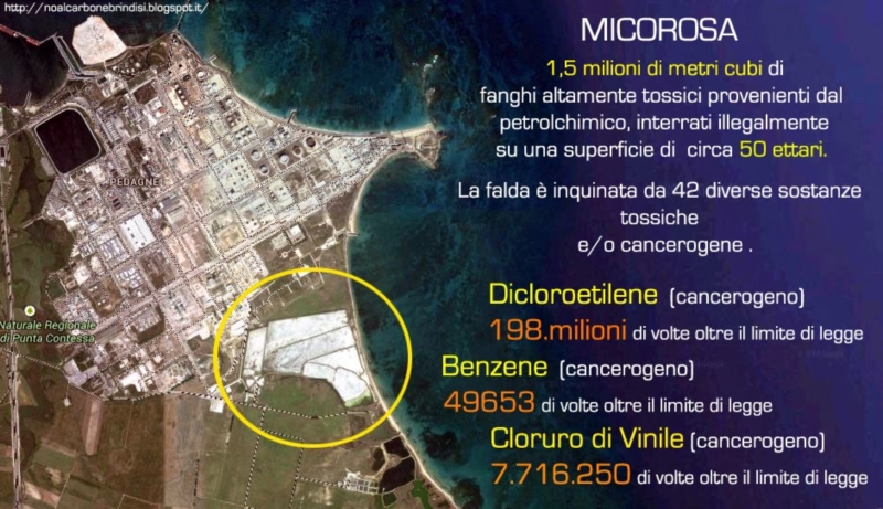 Si è svolta ieri la conferenza stampa per presentare i contenuti e le motivazioni dell’ esposto e della diffida, aventi ad oggetto la discarica industriale Micorosa di Brindisi, depositati il 19-giugno-2014 presso gli uffici della Procura della Repubblica di Brindisi e, nel caso della diffida, inviata al Ministero dell’Ambiente.L’esposto riguarda l’area immediatamente a sud del polo petrolchimico che ha una superficie di circa 50 ettari e che, tra il 1962 e il 1980, è stata utilizzata indiscriminatamente come sito per lo smaltimento dei residui di lavorazione industriale del Petrolchimico; fanghi tossici e ceneri per un volume di circa 1,5 milioni di metri cubi. A seguito dai dati emersi dalla caratterizzazione effettuate nel 2010, nel 2011 la zona è stata interdetta al pubblico con ordinanza sindacale per gli elevati livelli di sostanze tossiche presenti, nelle quali emergono eclatanti valori di inquinanti milioni di volte superiori ai limiti imposti dalla legge, con conseguente contaminazione di suolo, falda e ambiente marino. Caratterizzazioni effettuate su incarico del comune di Brindisi e quindi con soldi pubblici. Nel 2013 la Provincia di Brindisi ha diffidato le aziende coinvolte alla messa in sicurezza dell’area, tale ordinanza però è stata annullata dal Tar di Lecce che ha individuato nel Ministero dell’Ambiente, l’Ente competente per l’emanazione dell’atto. Tuttavia nella stessa sentenza, oltre a confermare le motivazioni dell’ordinanza, vengono anche individuate come responsabili due aziende controllate dall’ ENI, la Syndial spa e la Versalis spa, che hanno sostanzialmente ereditato l’area dai soggetti (Montecatini e Montedison) che hanno materialmente inquinato la stessa area. Per tale motivo, le due società si dovranno fare interamente carico degli oneri di bonifica, come prescrive la Legge, in coerenza con il principio di “chi inquina paga”. Né può valere, sempre a detta del Tar di Lecce, l’assunto che tali oneri siano da addebitarsi alla Micorosa srl, ormai fallita dal 2000. Inoltre, si evidenzia che le varie società che si sono succedute a vario titolo nella gestione dell’area, sino alle attuali società Syndial e Versalis, non hanno provveduto al suo disinquinamento neanche a livello minimo, né hanno attivato interventi di messa in sicurezza per arginare il fenomeno di contaminazione dei terreni e della falda.