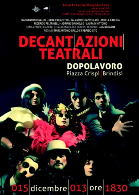 Dopolavoro e TeatroDellePietre presentano Decant(azioni) teatrali: uno spettacolo di-vino sul vino in cui una sgangherata compagnia, “sorpresa” dal pubblico durante le prove dello spettacolo che sta allestendo, cercherà di intrattenere gli ospiti come meglio può. Il pubblico verrà invitato ad assistere alle “prove” dello spettacolo degustando vino, mentre Bacco in persona sovrintenderà allo svolgimento della serata. Il gusto del teatro e le note inebrianti del vino per un aperitivo “animato” e decisamente fuori dal comune.