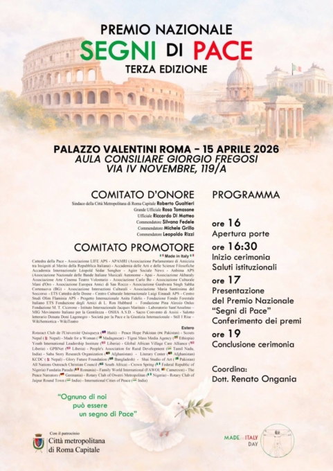 Mercoledì 15 aprile alle ore 17.00, presso Palazzo Valentini – Aula Consiliare "Giorgio Fregosi", Alessandro Nardelli, giornalista ostunese e direttore della testata In Puglia 24, sarà insignito del Premio Nazionale "Segni di Pace", giunto alla terza edizione, per il suo impegno accademico e culturale sul tema dell'educazione alla pace.