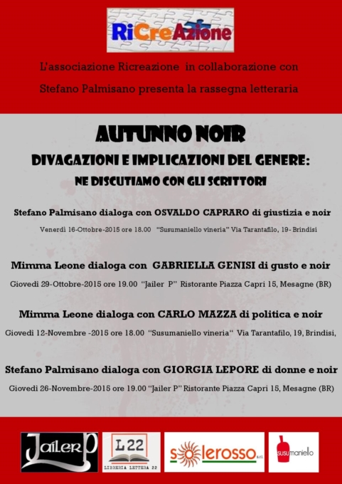 Di questo e di altro ancora, discuterà Mimma Leone, dell’Associazione Ricreazione, con Carlo Mazza, noirista barese in cui lo sguardo civile, l’analisi politica della società che lui racconta è più fine e più strettamente intrecciata a una grande capacità di costruire trame avvincenti, pur in uno stile asciutto e scorrevolissimo.