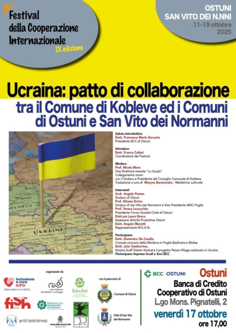 La Banca di Credito Cooperativo di Ostuni ospiterà un evento chiave del Festival della Cooperazione Internazionale, in cui si approfondirà il Patto di Collaborazione tra Ostuni, San Vito dei Normanni e Kobleve (Ucraina), volto a promuovere pace, solidarietà, sviluppo sostenibile e relazioni di fratellanza tra le comunità europee e ucraine.Nell’ambito della nona edizione del Festival della Cooperazione Internazionale, la Banca di Credito Cooperativo di Ostuni ospiterà un importante incontro dedicato alla firma e presentazione del Patto di Collaborazione tra il Comune di Kobleve (Ucraina) e i Comuni di Ostuni e San Vito dei Normanni.