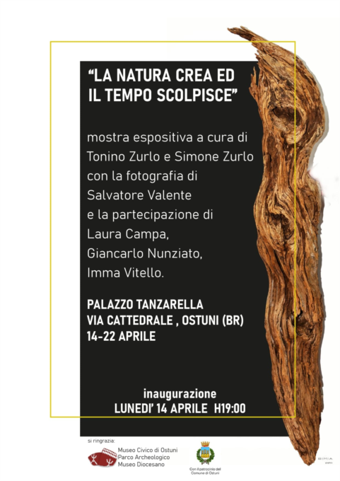 A partire da lunedì 14 aprile alle ore 19.00, presso Palazzo Tanzarella (Via Cattedrale), sarà visitabile la mostra "La natura crea ed il tempo scolpisce", un'esposizione che celebra la pianta che più rappresenta la cultura mediterranea, l'ulivo, segno vivente di una storia millenaria fatta di intrecci, contaminazioni e identità.La mostra – curata da Tonino e Simone Zurlo, artigiani e scultori del legno d'ulivo della bottega di artigianato artistico "L'Ulivo che Canta" – nasce dal desiderio di dar voce a forme naturali e creazioni che il tempo e il vento hanno saputo modellare.