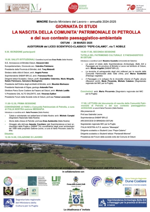 Il 28 marzo 2025, a partire dalle ore 10.00, si terrà presso l'Auditorium del Liceo Scientifico-Classico "Pepe-Calamo" di Ostuni la Giornata di Studi "La nascita della Comunità Patrimoniale di Petrolla e il suo contesto paesaggistico-ambientale".