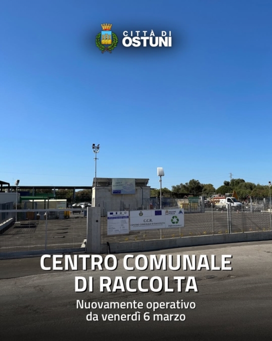 L’Amministrazione comunale di Ostuni informa la cittadinanza che da venerdì 6 marzo riapre il Centro di Raccolta Comunale in via Foggia.Gli accessi saranno regolamentati e controllati. Per il conferimento sarà richiesta all’utente la compilazione di un modulo nel quale indicare nome e cognome, gli estremi del documento, l’indirizzo dell’utenza e la tipologia di rifiuto conferito.