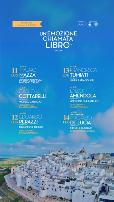 Appuntamenti in Largo Giuseppe Spennati nei pressi della Cattedrale di Ostuni ed evento speciale nel Chiostro di Palazzo San Francesco.La Città Bianca si prepara a vivere una nuova e intensa edizione di Un’emozione chiamata libro, il festival letterario che da trent’anni anima l’estate ostunese con incontri d’autore, dibattiti culturali e grandi nomi del panorama nazionale.