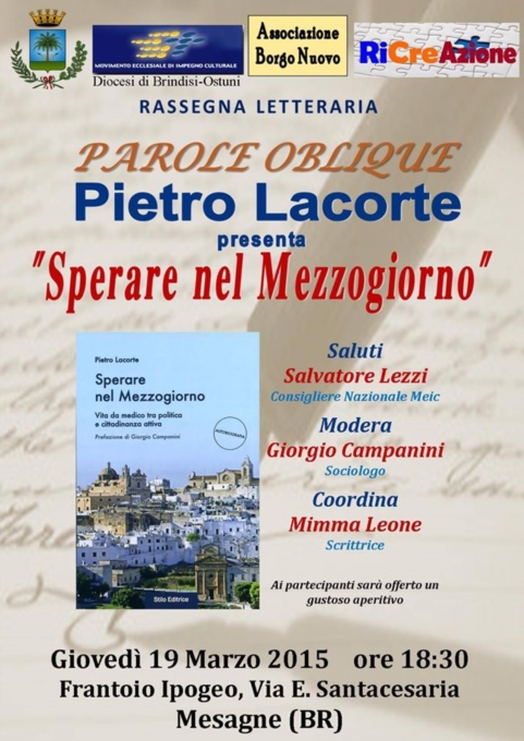 Prosegue la rassegna letteraria ‘Parole Oblique’ organizzata dall’Associazione ‘RiCreAzione’ con il patrocinio del Comune di Mesagne - Assessorato alla Cultura. L’appuntamento è fissato per giovedì 19 marzo 2015, con un dibattito che avrà come oggetto il libro, di recente pubblicazione, 'Sperare nel Mezzogiorno’ scritto da Pietro Lacorte, medico chirurgo da sempre al centro di esperienze di cittadinanza attiva e impegnato in iniziative di ispirazione cristiana. Il Dott. Lacorte, che ha esercitato negli ospedali di Brindisi e Ostuni, presenta in forma autobiografica una ricostruzione delle vicende politiche ed ecclesiali italiane, con particolare riguardo nei confronti del nostro territorio e dei valori che risultano necessari per costruire un Sud migliore. La discussione sarà arricchita dagli interventi del Consigliere Nazionale del Meic Avv. Salvatore Lezzi, della Presidenza Diocesana del MEIC e del Dott. Paolo Altare, presidente diocesano del MEIC.