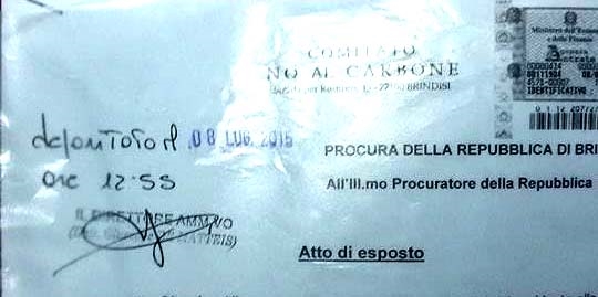 Per questo motivo, in data 8 luglio 2015, abbiamo depositato un esposto in Procura, in cui chiediamo che si dispongano le opportune indagini ed in particolare accertare se esiste ipotesi di reato, nella tutela della salute dei cittadini e dell'ambiente, e di accertare se il Sindaco di Brindisi abbia, oppure no, adempiuto ad un suo preciso dovere inerente la funzione di responsabile della salute pubblica.