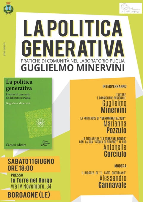 È così che Guglielmo Minervini racconta "La Politica Generativa", il suo libro pubblicato da Carocci che sarà presentato, alla presenza dell'autore, sabato 11 giugno, alle ore 18.00, nell'atrio interno della casa-torre cinquecentesca La Torre nel Borgo a Borgagne (Le).