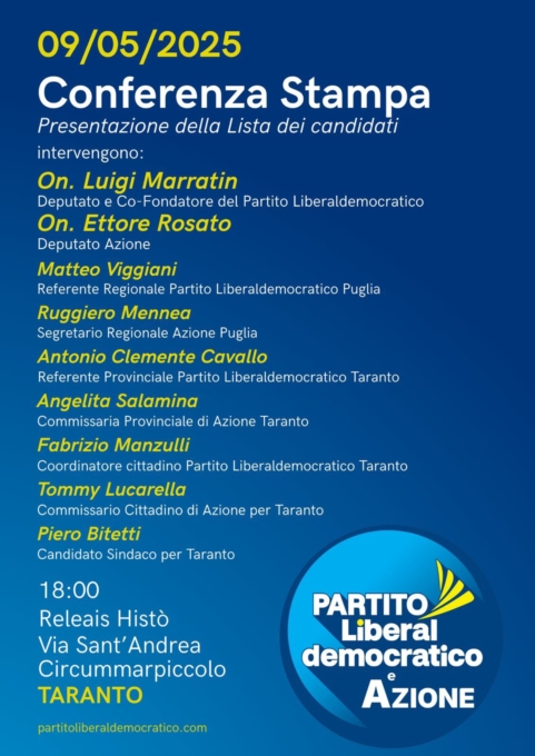 • Ore 18:00 – Conferenza stampa e presentazione ufficiale della lista per le elezioni amministrative, insieme all’on. Ettore Rosato (Azione), presso il Relais Histò San Pietro, via Sant’Andrea, Circummarpiccolo.