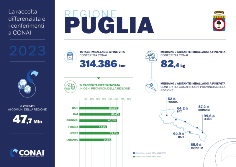 Guardando agli ultimi dati Ispra, la provincia più virtuosa rimane quella di Barletta-Andria-Trani, che differenzia quasi il 66,5% dei suoi rifiuti. Dalla provincia arriva a CONAI un pro-capite di oltre 64 chilogrammi di imballaggi a fine vita, in aumento rispetto ai 55 del 2022.