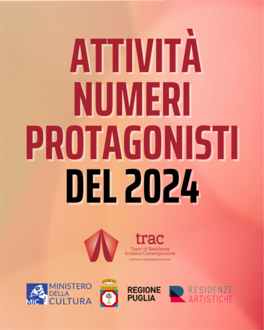 Il 2024 del TRAC è stato attraversato da momenti d’incontro e di confronto con le comunità di riferimento grazie a prove aperte e aperture pubbliche; dalla programmazione di spettacoli legati ai progetti in residenza, distribuiti nei vari poli del TRAC e dalle attività di tutoraggio per artisti in residenza a cura di Giorgio Testa – ideatore della Casa dello Spettatore e da Theatron 2.0. Oltre a questo, il TRAC ha dato vita a 4 progetti nazionali e 11 accordi di partenariato con i principali attori del Sistema dello Spettacolo. Grazie anche al supporto e alla collaborazione di numerosi partner: TRIC pugliese Teatri di Bari; Fondazione SAT organizzatore della vetrina di teatro ragazzi più importante del Sud Italia; il circuito regionale Teatro Pubblico Pugliese; gli altri Centri di Residenza italiani con cui è riunito in Coordinamento; i 10 Artisti nei Territori extraregionali con cui condivide progettualità di attraversamento; Assitej (la più grande rete di teatro ragazzi a vocazione internazionale); due Scuole di Alta Formazione; 2 musei; 3 poli Universitari; 16 Istituti scolastici di ogni ordine e grado; 5 parrocchie e 1 Caritas diocesana che offre al TRAC spazi/studio per gli artisti e una foresteria.