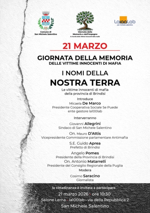 Il Comune di San Michele Salentino, in collaborazione con la Cooperativa Sociale Se Puede, celebra anche quest’anno la Giornata della memoria e dell’impegno in ricordo delle vittime innocenti di mafia con un momento pubblico di riflessione e mobilitazione civile in programma sabato 21 marzo alle ore 10.30 nel salone “Michele Lerna” de La100lab in via della Repubblica.L’iniziativa nasce con l’obiettivo di rinnovare l’impegno della comunità sui temi della legalità e della responsabilità civile, mantenendo viva la memoria delle vittime innocenti delle mafie. La comunità di San Michele Salentino ha conosciuto direttamente il dolore di queste tragedie con la perdita di Marcello Palmisano e Michele Lerna.