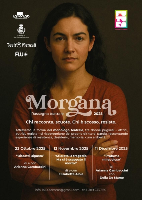 Tre monologhi, tre voci femminili, tre atti di resistenza che prendono forma sul palcoscenico. Questo è MORGANA, la rassegna teatrale ideata da la100lab, bene confiscato alla criminalità organizzata, e realizzata in collaborazione con il Teatro Mezzadì e il collettivo artistico FLUO, con il patrocinio del Comune di San Michele Salentino.