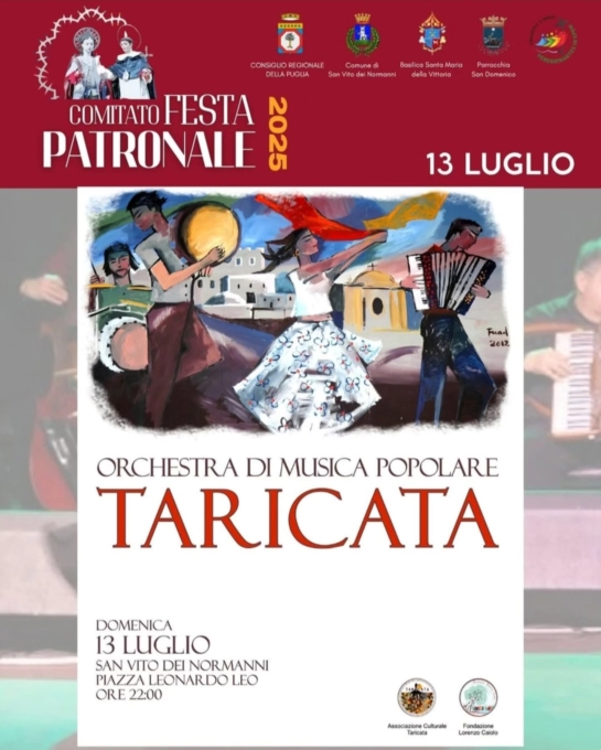 È atteso per domenica 13 luglio un grande concerto dell'Orchestra Popolare Taricata, all'interno del ricco programma predisposto dal Comitato per la Festa Patronale di San Vito dei Normanni (10-14 luglio).Saranno il ritmo, la melodia e le impetuose danze della Taricata, gruppo di pizziche e canti popolari da 48 anni, a riunire tutti in piazza Leonardo Leo a partire dalle ore 21.30. Tra brani nuovi e pietre miliari dell' antico repertorio, non mancheranno le emozioni in un intreccio di tradizione e necessità attuali ancora sensibili al potere benefico di questi suoni.