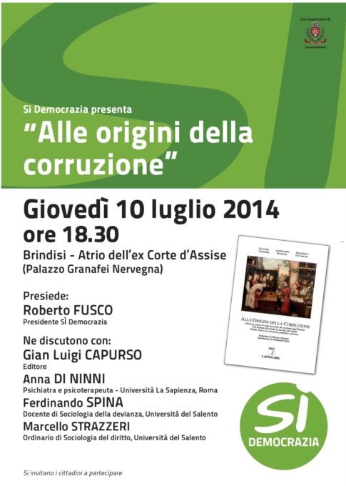 GIOVEDI' 10 LUGLIO 2014 AD ORE 18,30 NELL'ATRIO DELLA EX CORTE DI ASSISE DI PALAZZO NERVEGNA, IN BRINDISI IN VIA DUOMO, SI DEMOCRAZIApresenterà il libro "ALLE ORIGINI DELLA CORRUZIONE"