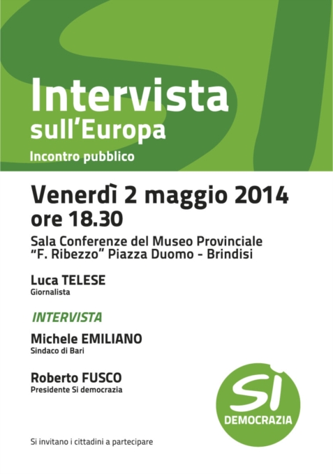 Il 2 Maggio prossimo, su iniziativa del movimento politico SI' DEMOCRAZIA, si terrà un'iniziativa che vedrà il giornalista LUCA TELESE intervistare l'attuale Sindaco di Bari MICHELE EMILIANO e il Presidente di SI' DEMOCRAZIA, ROBERTO FUSCO.L'evento si svolgerà presso il salone del Museo Provinciale di Brindisi alle ore 18.30.