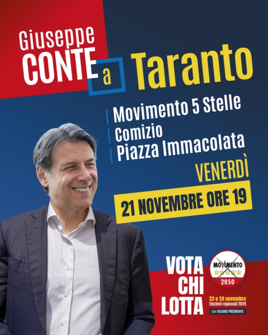 VENERDÌ 21 NOVEMBRE ORE 19, A TARANTO, IN PIAZZA IMMACOLATA, grande chiusura della campagna elettorale del M5s per le elezioni regionali Puglia.Saranno presenti il Presidente del Movimento 5 Stelle Giuseppe Conte, il Vicepresidente Mario Turco, sindaci ed eletti del territorio, insieme ai candidati M5s al prossimo Consiglio Regionale.
