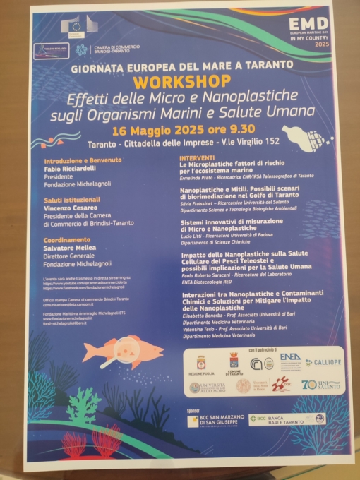 Il 16 maggio un Workshop sull'impatto ambientale di Micro e Nanoplastiche organizzato da Fondazione Michelagnoli e Camera di Commercio di Brindisi-Taranto: una crescente preoccupazione per gli Ecosistemi Marini e la salute umanaLa Fondazione Michelagnoli, in collaborazione con la Camera di Commercio Brindisi-Taranto, celebra la Giornata Europea del Mare 2025 promossa dalla Commissione Europea per evidenziare il ruolo vitale dei mari come fattore di crescita economica.