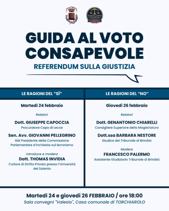 L'Amministrazione Comunale di Torchiarolo, di concerto con il comitato civico "Guida al voto consapevole", promuove presso la Sala convegni "Valesio" della Casa comunale un ciclo di incontri dal titolo "Guida al voto consapevole" per approfondire i temi del prossimo Referendum sulla Giustizia. Il programma si articola in due appuntamenti fissati per le ore 18:00: martedì 24 febbraio il dibattito sarà incentrato sulle ragioni del "Sì" con gli interventi del Dott. Giuseppe Capoccia, Procuratore Capo di Lecce, e del Sen. Avv. Giovanni Pellegrino, già Presidente della Commissione Parlamentare d'inchiesta sul terrorismo, introdotti e moderati dal Dott. Thomas Invidia, Cultore di Diritto Privato presso l'Università del Salento; giovedì 26 febbraio l'attenzione si sposterà sulle ragioni del "No" con il Dott. Genantonio Chiarelli, Consigliere Superiore della Magistratura, e la Dott.ssa Barbara Nestore, Giudice del Tribunale di Brindisi, con la moderazione di Francesco Palermo, assistente giudiziario presso il Tribunale di Brindisi. L'iniziativa si propone di offrire alla cittadinanza un'occasione di confronto tecnico e plurale, garantendo la presenza di relatori autorevoli per favorire una partecipazione al voto libera e pienamente informata.Ricerca
