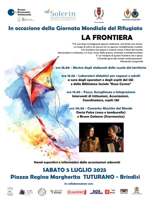 In occasione della Giornata Mondiale del Rifugiato, sabato 5 luglio a Tuturano (Brindisi), in piazza Regina Margherita, a partire dalle ore 18.00, si terrà un evento aperto a tutti i cittadini sul tema dell’accoglienza e dell’integrazione. L’iniziativa è promossa: dalla Cooperativa Solerin (Solidarietà e Rinnovamento) che gestisce il Centro Sai di Brindisi con sede a Tuturano in via Leonardo Leo; dal Consorzio sociale dell’Ambito Br/1 e con il patrocinio del Comune di Brindisi.Il Centro SAI di Brindisi accoglie esclusivamente nuclei familiari di rifugiati o richiedenti asilo per un periodo di sei mesi (prorogabili ad un anno in casi eccezionali). Durante la permanenza sono offerti servizi di alfabetizzazione linguistica, accompagnamento legale all'audizione in Commissione, orientamento sociale e lavorativo, segretariato sociale nel disbrigo pratiche, assistenza sanitaria e psico-sociale, sostegno per l'integrazione, etc. Non sostituisce l'ospite in alcuna di queste attività, ma lo aiuta ad acquisire strumenti utili all'autonomia socio-lavorativa, con l’obiettivo di consentire agli ospiti di riconquistare l’indipendenza e ricostruire nel Paese che li ospita una vita ed un futuro dignitosi, consapevoli dei loro diritti e doveri.