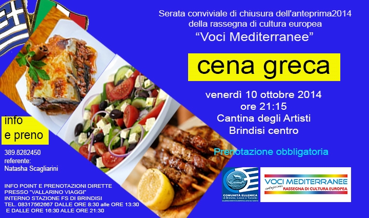 Naturalmente non poteva mancare per questa fine rassegna la serata greca: cena con menù greco e musiche elleniche. (info 389.8282450 / cebrindisi.le.ta@gmail.com – prenotazione obbligatoria).