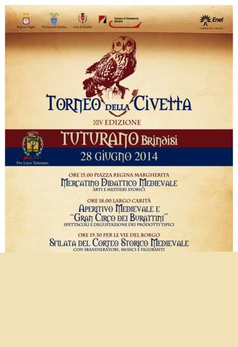 E’ online il video contest “Filmare il Medioevo”, ideato dall’associazione Pro Loco di Tuturano per la valorizzazione storica-culturale e la promozione turistica della XIV edizione del Torneo della Civetta, in programma per il 28 giugno.La partecipazione al concorso è gratuita e aperta a tutti coloro che siano in grado di realizzare un video, che abbia le caratteristiche di uno spot pubblicitario, da utilizzare per il lancio della campagna pubblicitaria online e offline della XV edizione della manifestazione.