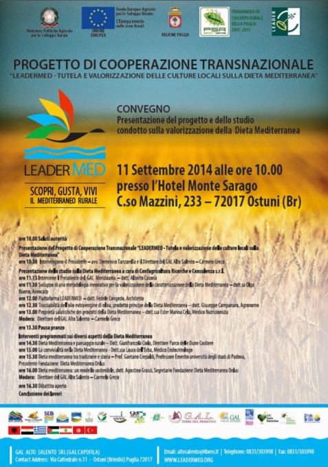 Nella sessione pomeridiana, gli interventi sui diversi aspetti della dieta mediterranea: dai riflessi sul paesaggio rurale ai benefici effetti sulla salute. I lavori saranno moderati dal direttore del Gal Alto Salento Carmelo Greco. Tra gli aspetti più innovativi del progetto, l’interazione con il web e con i social network: attraverso il sito www.leadermed.info, la dieta mediterranea diventa esplorazione diretta, per una raccolta di storie e di emozioni che rendano evidenti i legami fra cibo e comunità. Il mangiar bene seguendo la dieta mediterranea diventa non solo un’esperienza sensoriale a 360 gradi, ma anche un luogo della memoria, come testimoniano le 10 ricette della cucina tipica pugliese rivisitate in chiave mediterranea. L’appuntamento di Ostuni, dunque, segna l’inizio di un percorso plurale e innovativo che – proprio attraverso i Gal - impegna amministratori, Operatori, portatori d’interesse, cittadini, verso l’ambizioso orizzonte di Leadermed.